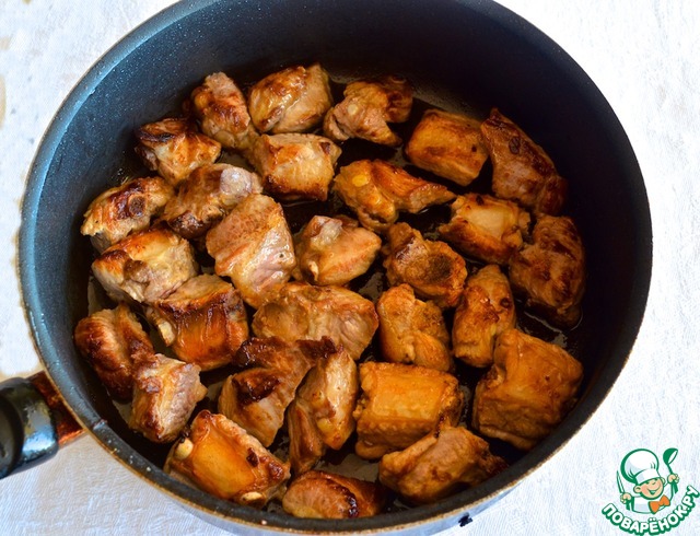 В оставшемся жире обжарить ребрышки, снизить огонь до минимума, влить половину грибного бульона, добавить лавровый лист и тушить до мягкости примерно час. Жидкость должна покрывать содержимое сотейника, поэтому, при необходимости, добавьте воды.