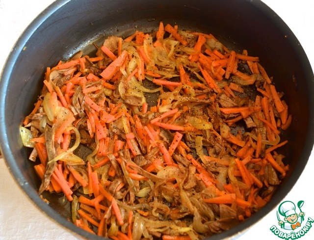 Лук порезать полукольцами средней толщины, морковь – соломкой, а перец - кольцами. Обжарить лук в подсолнечном масле, добавить морковь, протушить несколько минут, добавить перец, а потом вареные грибы.