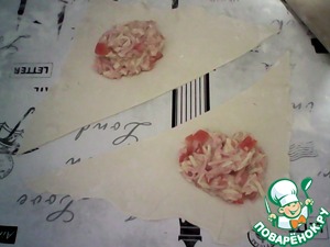 • Немного раскатываем, форма произвольная (но если шов, то вниз и прокалываем в нескольких местах тесто) На тесто кладем начинку. И заворачиваем.