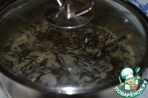 На дргой сковороде обжарить рис, долить к нему воды, посолить и варить до полуготовности, доливая воду и помешивая.
