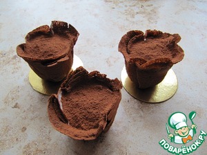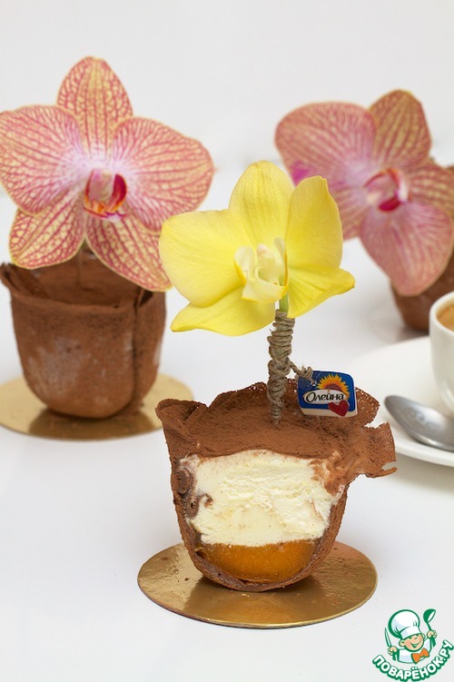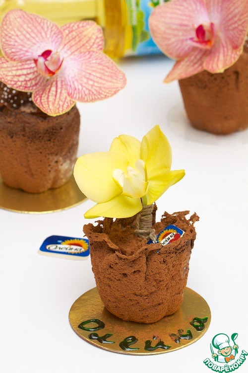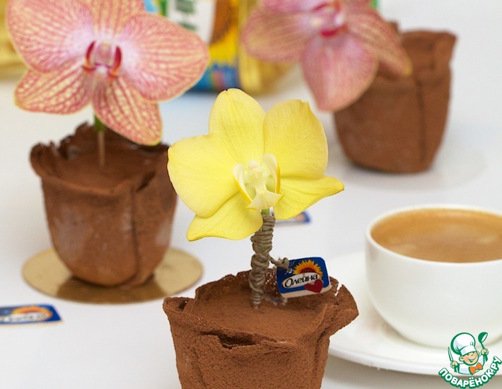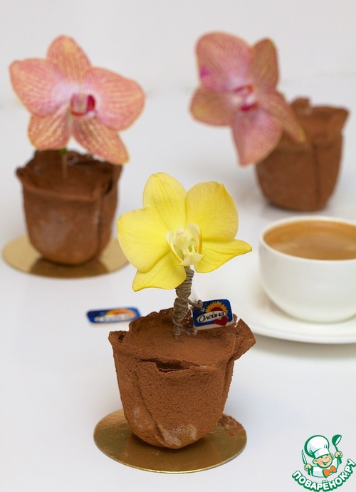 Освободить десерт от формочек, посыпать какао-порошком со всех сторон, имитируя цветочный горшок. Для украшения в цветок воткнуть зубочистку, вставить в десерт.