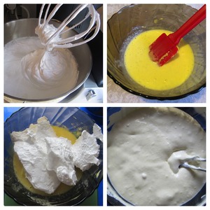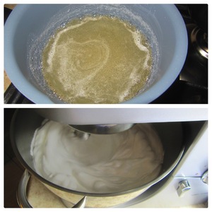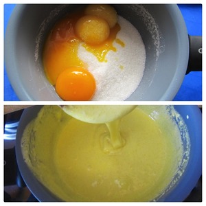 Для приготовления желтковой массы в небольшой кастрюльке смешать сахарную пудру (желательно) или сахар мелкого помола с желтками, добавить ванильный сахар, смешать, поставить на водяную баню или осторожно готовить в кастрюле с толстым дном, чтобы только не заварить желтки! Растирать сахар с желтками в пену до увеличения в объеме, загустения и получения рельефных полосок! По времени - на водяной бане около 25 минут, в кастрюльке - около 10 минут, затем немедленно переложить готовую массу в другую посуду, чтобы остановить процесс заваривания желтков. Соединить половину желтковой массы с половиной белкового заварного крема, перемешать до однородного состояния (смесь №1).