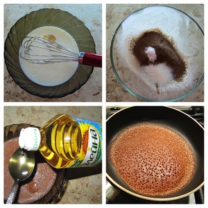 Смешать просеянную муку, какао, сахар, щепотку соли, соду, ванильный сахар. Взбить яйца с молоком, добавить растительное масло (использую масло ТМ Олейна), перемешать до однородности. Выпекать на хорошо разогретой сковородке (диаметр 18 см, выход - около 17 блинчиков). Тесто должно хорошо литься, консистенцию при необходимости отрегулировать добавлением молока.