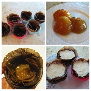Десерт состоит из блинчиков с начинкой: домашнее мороженое и целые половинки крупных абрикосов с лавандой (варенье), щедро посыпанные какао. Для приготовления белкового заварного крема сахар соединить с горячей водой, размешать до полного растворения сахара, поставить на маленький огонь до закипания и выпаривания жидкости до пробы на мягкий шарик (чайной ложечкой взять сахарный сироп и опустить в холодную воду на блюдце. Сироп схватывается и из него можно скатать шарик. Пока сироп находится в процессе приготовления - взять охлажденные белки и взбивать до мягких пик. Готовый горячий сироп сразу же влить тоненькой струйкой во всбивающиеся белки, продолжить процесс взбивания до практически полного охлаждения белков. Готовый крем накрыть пищевой пленкой и поставить в холодильник.