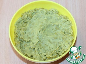 • Через 2 минуты выкладываем картофельное пюре и пюре из горошка в сковороду. Добавляем 2-3 ст. л. подсолнечного масла. Также можно добавить 1 ч. ложку карри, чёрный перец, немного морской соли для вкуса. Прогреть начинку, периодически перемешивая, 2-3 минуты. Фарш готов!