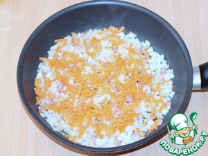 • Как только бекон слегка обжарится (1-2 мин), добавить мелко нарезанный репчатый лук