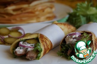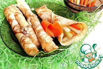 • кладем начинку, немного зеленых перьев лука и заворачиваем рулетом. Можно завязать рулет пером зеленого лука. К таким блинчикам можно подать гранатовый соус или сырный соус. Как приготовить соус, читайте мои рецепты на этом конкурсе.