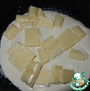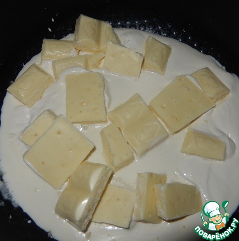 • Шоколад растапливаем вместе со сливками, а затем эту смесь добавляем к клубнике и как следует перемешиваем. Даем начинке отдохнуть пару часов, чтобы стружка немного обмякла.