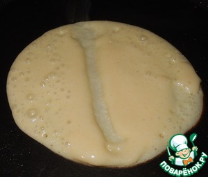 • На каждый блин берем по 1 ст. л. теста и разравниваем на сковороде, по центру делаем углубление.