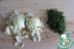 Мелко режем укроп и лук. Если лук ядреный, заливаем его кипятком минут на 5, потом промываем в холодной воде и откидываем на сито.