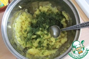 Вареный картофель разминаем в пюре, высыпаем к нему укроп и вливаем масло, перемешиваем. Ах, какой дух!
