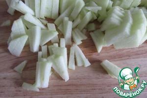 Яблоко очищаем от кожуры и семенной коробочки и режем тонкой мелкой соломкой. Как-то раз я натерла яблоко на крупной терке, оно сразу выделило много сока, а это не совсем хорошо для нашего блюда.