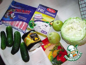 Смешать рис, яйца, огурцы, яблоки, кукурузу, крабовые палочки (немного оставить для украшения). Добавить капусту, растирая еe между ладонями. Перемешать с майонезом. Выложить в салатник, украсить кольцами крабовых палочек.