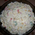 8 -го августа у отца был День Рождения, ездила к нему в деревню, наготовила-а-а... Так что сегодня я представлю сразу несколько блюд. Первым будет салатик. Салатов с крабовыми палочками множество, и я решила объединить их скопом в одном блюде (чтобы всем гостям хватило). Результат: салат получился очень нежным, лeгким. Продукты оказались очень даже сочетаемыми.