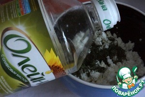 В творог добавить измельченный укроп и 2-3 ч. ложки растительного масла Олейна с оливковым маслом. Растереть в пасту. Кол-во масла зависит от сухости творога.