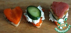 Далее собираем наши канапе. На блин кладем перец, далее творожную массу, потом огурец, опять блин и рыбу. Можно еще кусочек рыбки добавить в середину.
