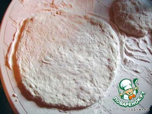 Тесто разделить на 2 части, раскатать (или растянуть руками) каждую в нетонкую лепешку. Руки, чтобы к ним не липло тесто, обильно присыпать мукой или смазывать подсолнечным маслом.