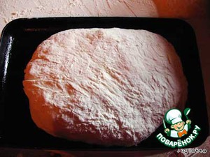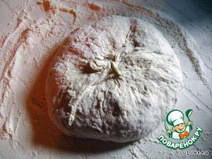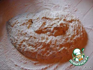 Ровную поверхность хорошо присыпать мукой, аккуратно вывалить тесто (не вымешивая).
