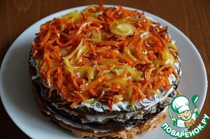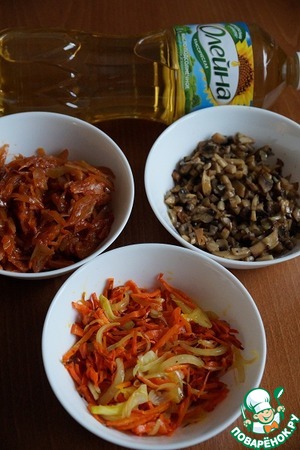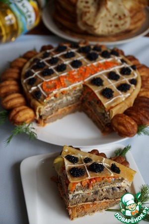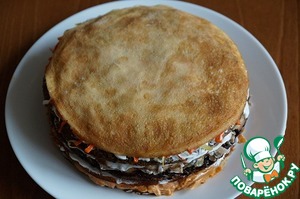 Блин-сметана-печеночный блин-капустная начинка-блин-сметана-печеночный блин-грибная начинка- блин-сметана-печеночный блин-морковная начинка-блин