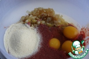 К печени добавляем 3 яйца, половину луковицы (поджаренной до прозрачного состояния), 3 ст. л. манной крупы, соль, перец.