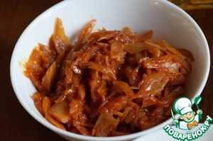 Капусту шинкуем, тушим до готовности, по желанию добавляем томатную пасту, приправляем солью, перцем. -