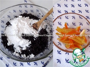 Апельсиновые цукаты вынуть из сиропа и нарезать полосками.