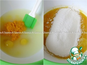 Теперь займемся блинами. Смешать в миске теплую сыворотку, тыквенное пюре, соль, сахар, соду и яйца. Добавить просеянную муку.