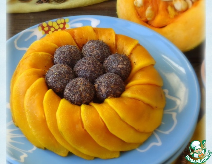 Предлагаю приготовить просто потрясающий десерт - блинный террин, в виде цветка подсолнуха. Террин получается не только вкусным, но и красивым, даже праздничным! Любители маковой начинки непременно оценят такой вариант. Плюс ко всему, в начинке присутствуют и апельсиновые нотки. У меня, на такой случай, всегда припасены апельсиновые цукаты, остается их только нарезать полосками. Ах, да, тыква! Она здесь выступает не только в роли оформления этого десерта. Тыква тоже получается очень вкусной, так как она карамелизируется и, конечно же, придает шарм всему десерту. В общем, если вам нравится такой вариант, приступим!