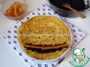 Блины нафаршировать начинкой: сначала выложить по ложке мака и распределить его по ширине блина. А на мак положить по паре полосок апельсиновых цукатов. Закрутить блины в трубочку.