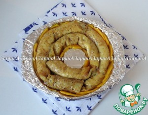 Затем выложить поверх тыквы блинные трубочки, смазывая их желтком, смешанным с парой ложек сахара.