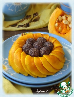Готовыми тыквенными пластинками выложить форму (d = 20 см) с отверстием.