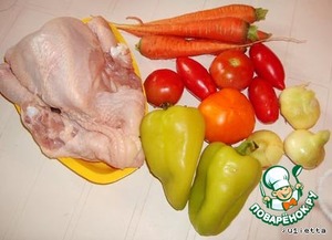 Приготовить ингредиенты. Помидоры были мелкоплодными, а морковка - молодая. Поэтому взяла бОльшее количество, чем указано. А цыпленок лишился голеней - ушли сюда: https://www.povarenok.ru/recipes/show/10262/