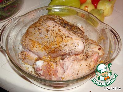 Тушку цыпленка посолить, поперчить, приправить по вкусу и оставить на 20-30 минут.