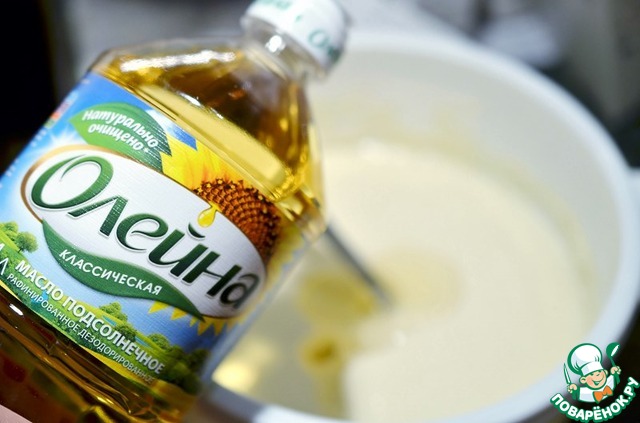 В миску раскрошить дрожжи, всыпать ложку сахара, растереть, влить стакан теплого молока, всыпать щепотку соли, всыпать 2/3 стакана просеянной муки, перемешать – комочков быть не должно, поставить тесто на теплую водяную баню, накрыв полотенцем. Спустя 30-40мин опара должна подняться, ввести в нее желтки яиц, теплое растопленное сливочное масло, 1 ст. л. растительного масла Олейна.