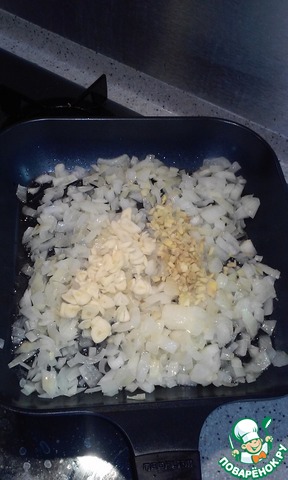Выкладываем лук в сковороду, перемешиваем и жарим. Затем добавляем в сковороду с луком чеснок и имбирь. Перемешиваем и жарим, пока они не станут мягкими.