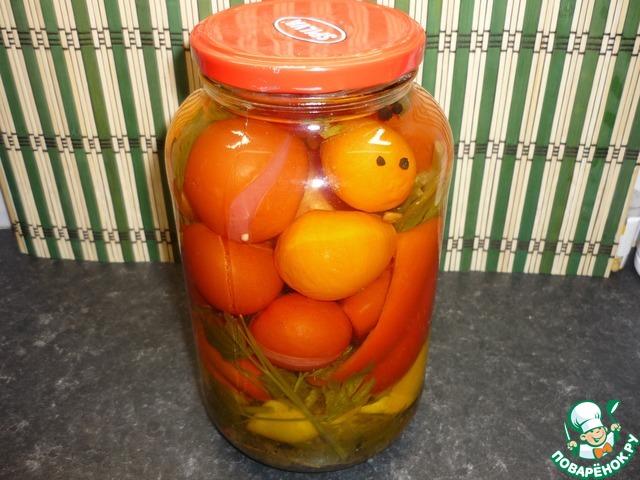 Помыть помидоры, болгарский перец (перец нарезать), очистить чеснок, помыть и измельчить укроп. Все сложить в 3-х литровую банку.