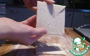 Далее - загибаем уголочки в центр. Один загнули, один - той же стороны - пропустили, 1 загнули, 1 пропустили. И так 4 угла у нас окажутся в центре. Скрепляем уголки.