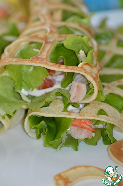 Конечно сейчас такими "Ажурными" блинчиками уже ни кого не удивишь. А вот начинка в них может приятно удивить и порадовать. Красивые блинчики с любимым салатом "Цезарь" будут прекрасной закуской на праздничном столе.