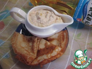 Часть салата перемалываем в блендере и получаем очень вкусный соус к нашим блинчикам.