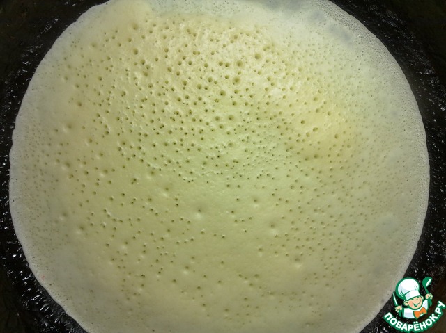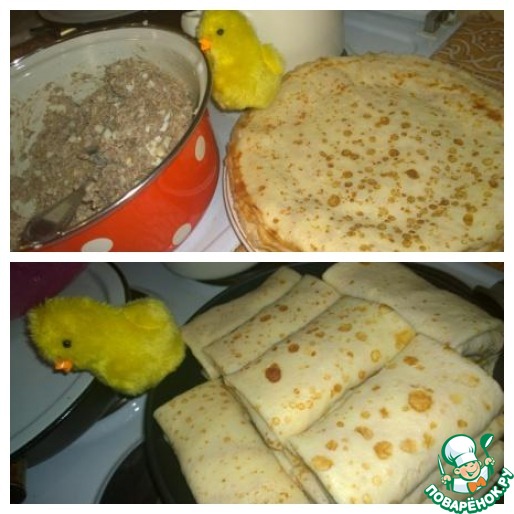 Для приготовления блинчиков с начинкой делаем тесто по любимому вами рецепту.
