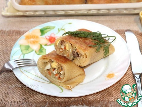 Блины, приготовленные по этому рецепту, получаются тонкими и нежными. Начинка выходит ароматной и сочной.