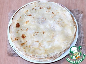Наливать тесто тонким слоем на раскалённую сковороду и выпекать до готовности. Блинчики складывать на блюдо и смазывать сливочным маслом. Накрыть крышкой.