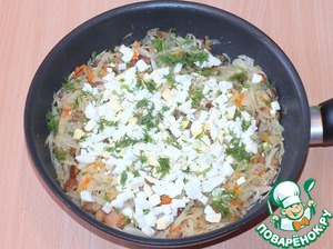 Добавить в сковороду нарезанные кубиком варёные яйца и мелко нарезанный укроп. Приправить солью и перцем.