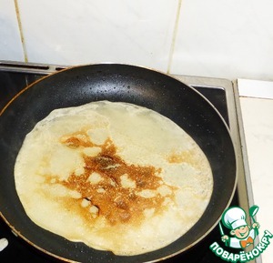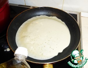 Приподнимаем сковородку и разгоняем лужицу по всей окружности блина. Масло должно затечь под края блина. Благодаря этому его можно будет легко перевернуть.