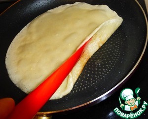 Подглядываем под блин. Он зарумянился, значит его можно переворачивать. -