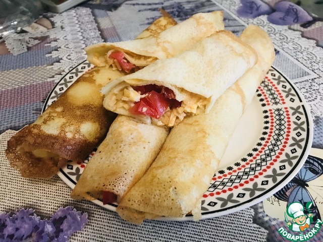 На готовый блин выложить начинку и свернуть блин в рулет.