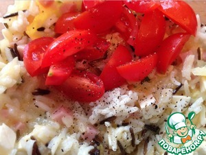 Смешиваем приготовленный рис, нарезанную ветчину, половину сыра, лук, яйцо