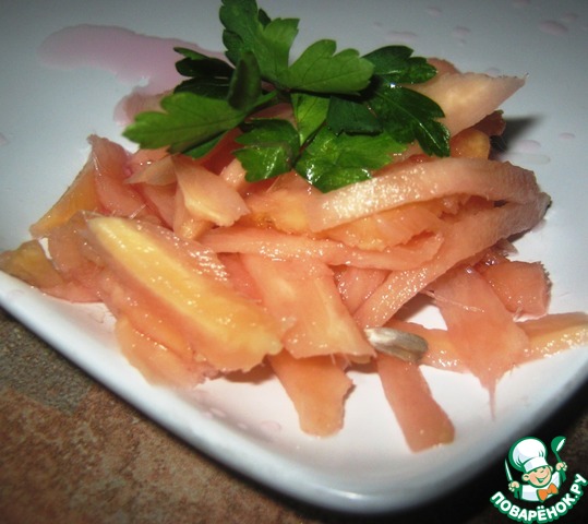 Нарезаем тоненькими пластинками - чем тоньше пластинка, тем вкуснее потом будет закуска.