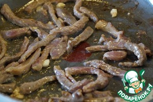 Нарезаем ее тоненькими полосками, добавляем нарезанный чеснок, перемешиваем и маринуем в смеси соевого соуса и оливкового масла,