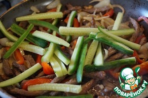 Добавляем огурцы, перемешиваем, готовим около минуты, потом вливаем остаток маринада от говядины, перемешиваем, держим еще секунд 30 и выключаем.